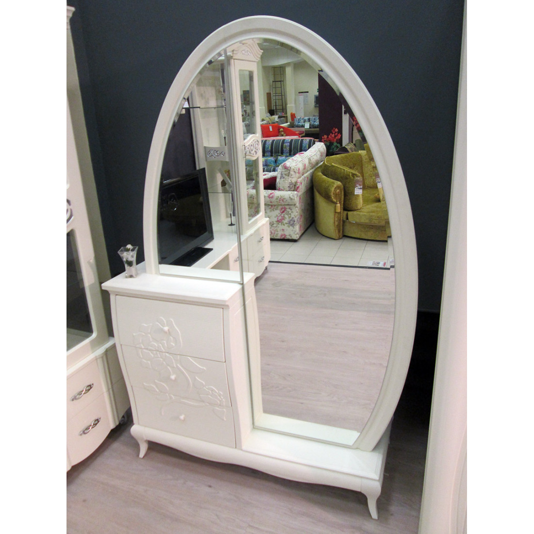 Комбинированный шкаф для одежды и белья с зеркалом МН-218-10 серии Астория от фабрики Мебель-Неман представляет собой разновидность оригинального трюмо и небольших размеров комода, состоящего из зеркала в полный рост в форме эллипса и вместительной тумбы. Купить утонченный и эффектный комплект для спальни стоит в любую просторную комнату – он придаст ощущения будуарности и великолепия в интерьер.
